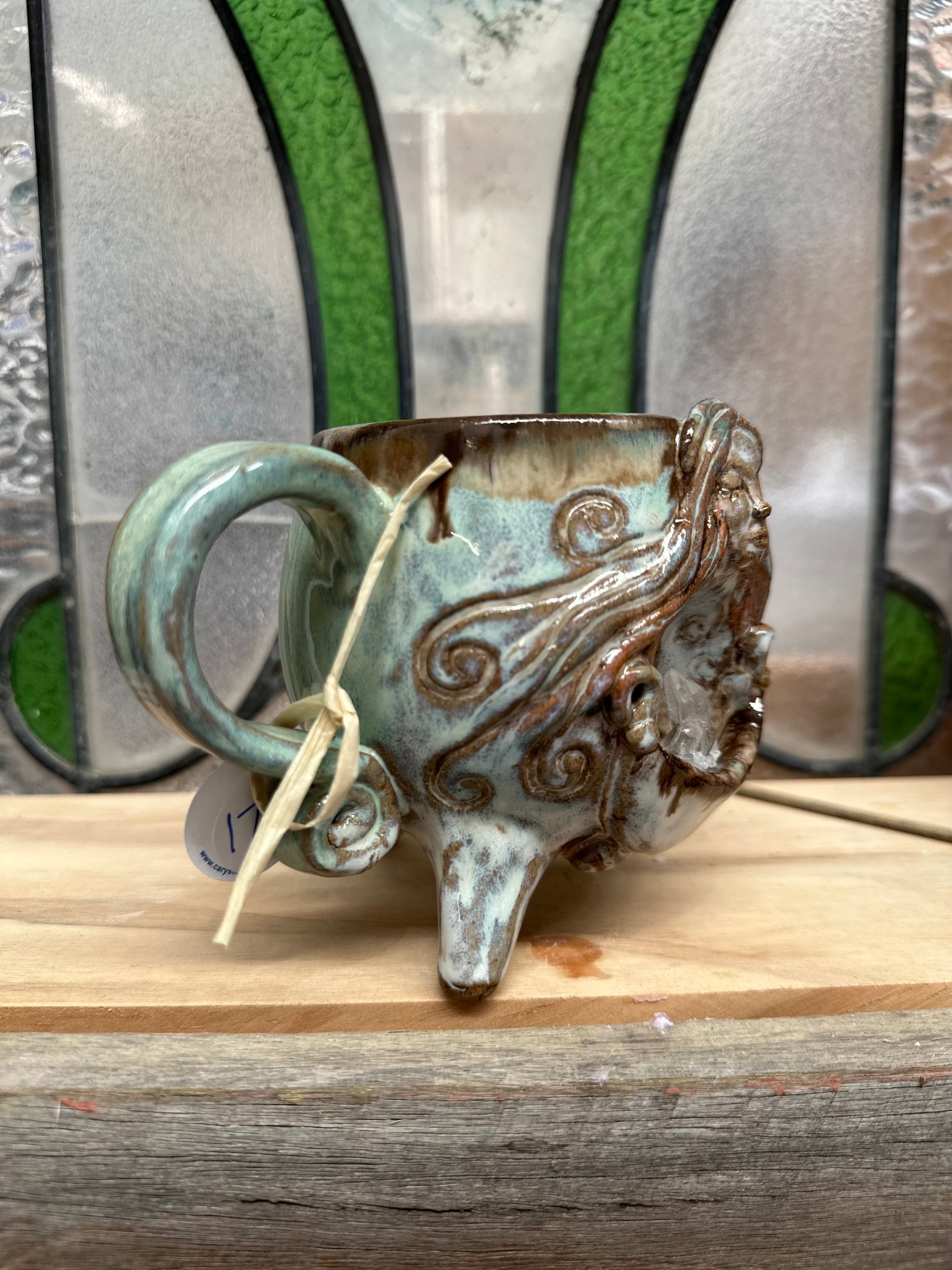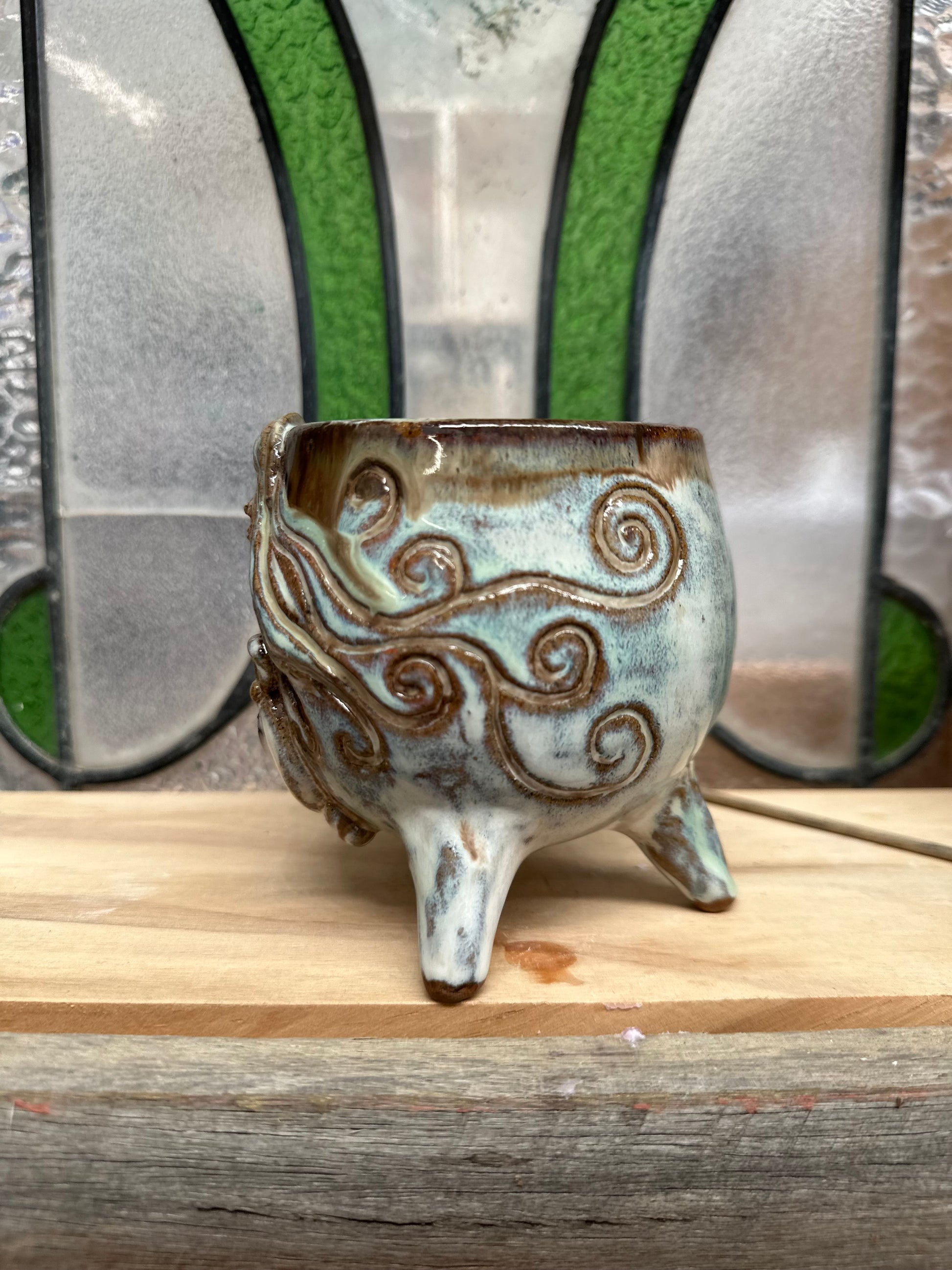 Glazed in tones of moss green, soft blue, and earthen brown, the cup’s surface captures the feeling of stone, water, and root - grounding yet full of quiet light. Standing on three strong legs, each piece is truly one of a kind.