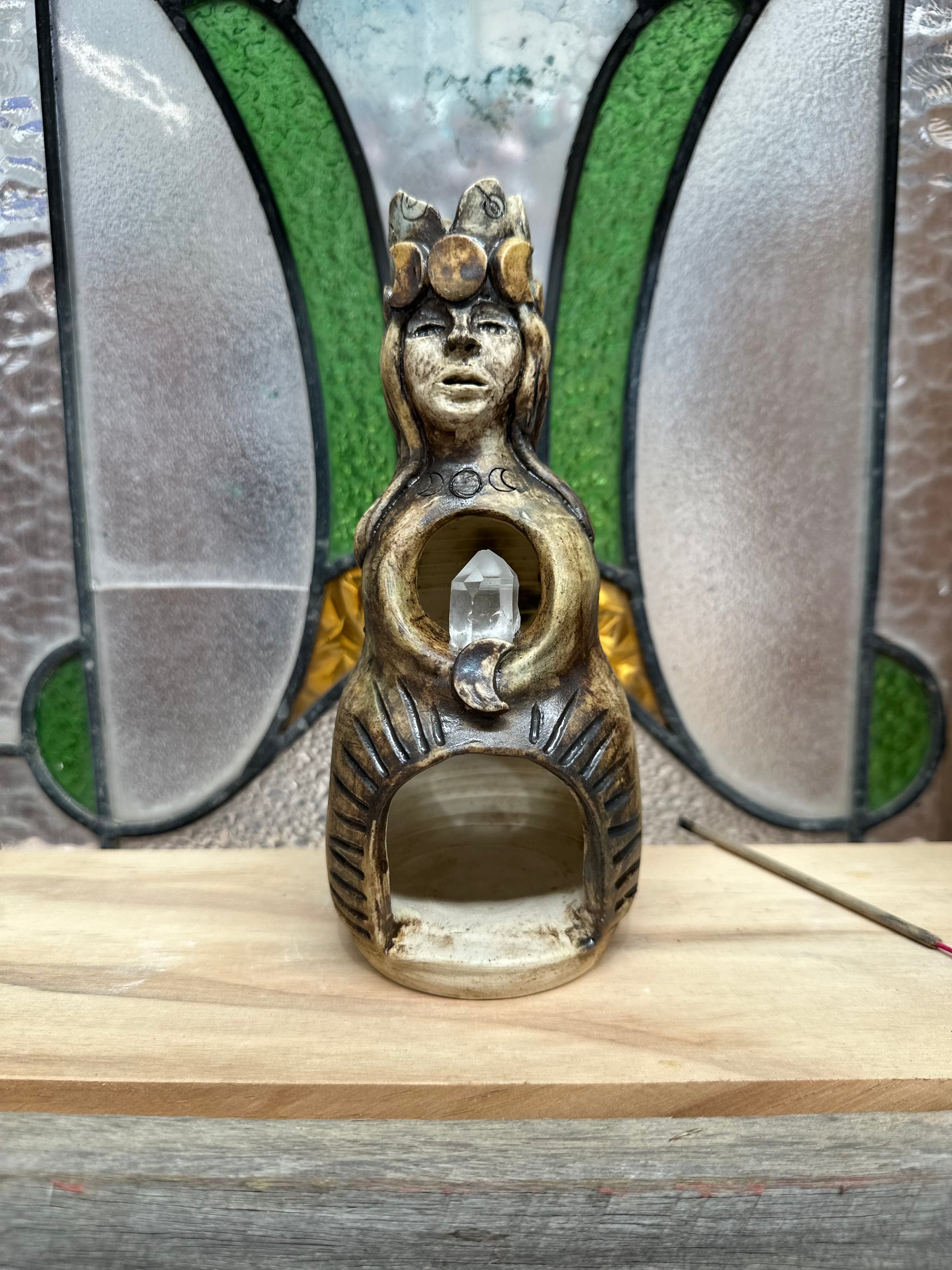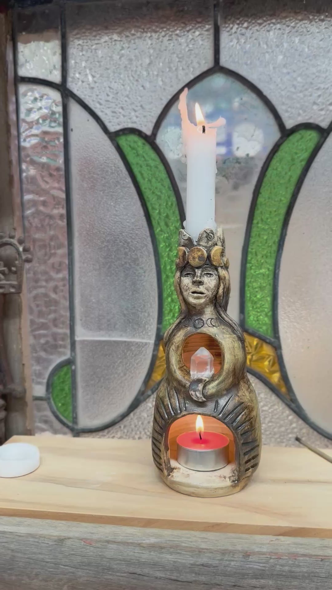 Triple Moon Crown - Her headdress bears the waxing, full, and waning moons, symbolising the eternal rhythm of creation, culmination, and release. The candle placed here calls in illumination, intuition, and cyclical awareness.