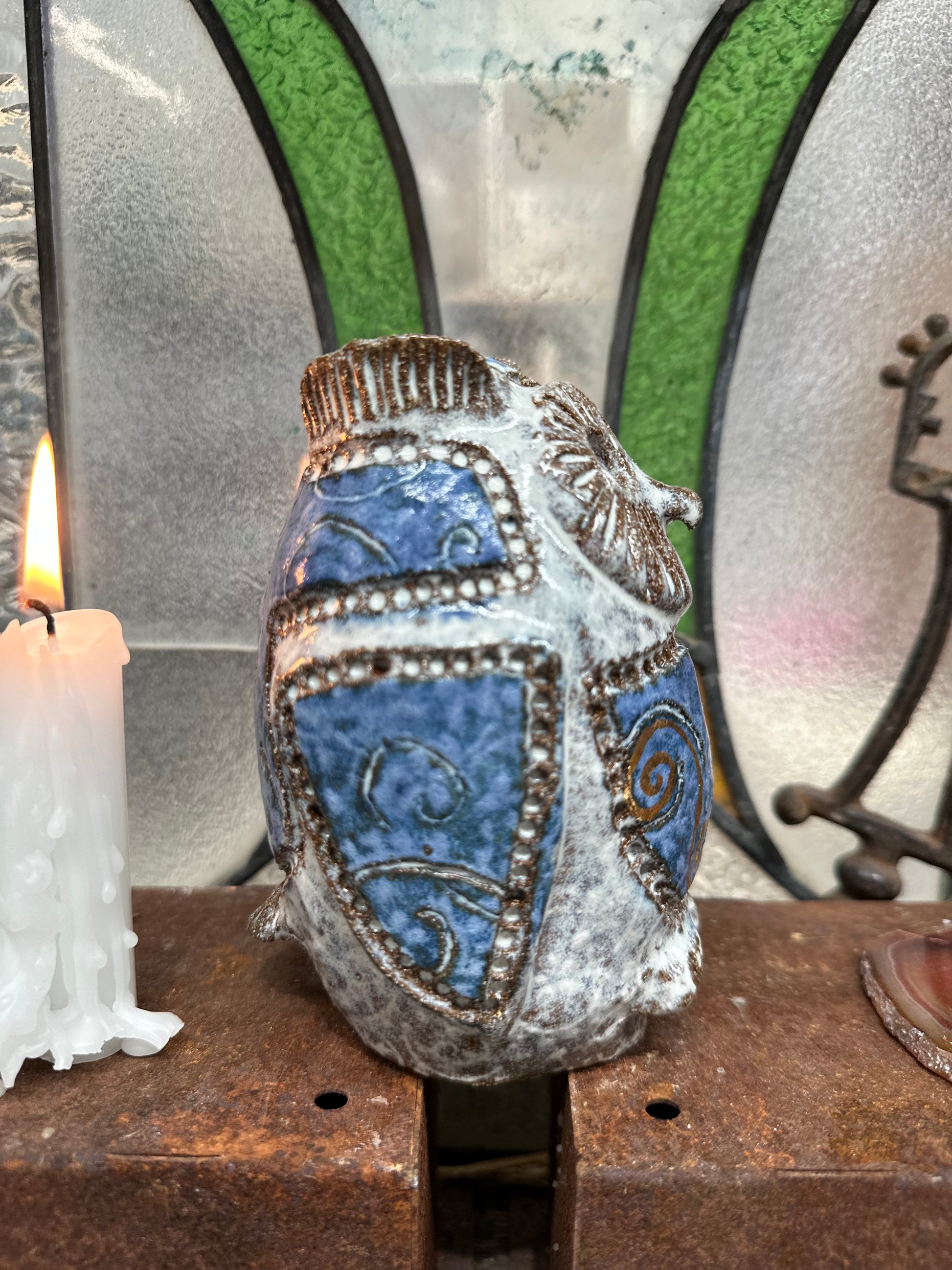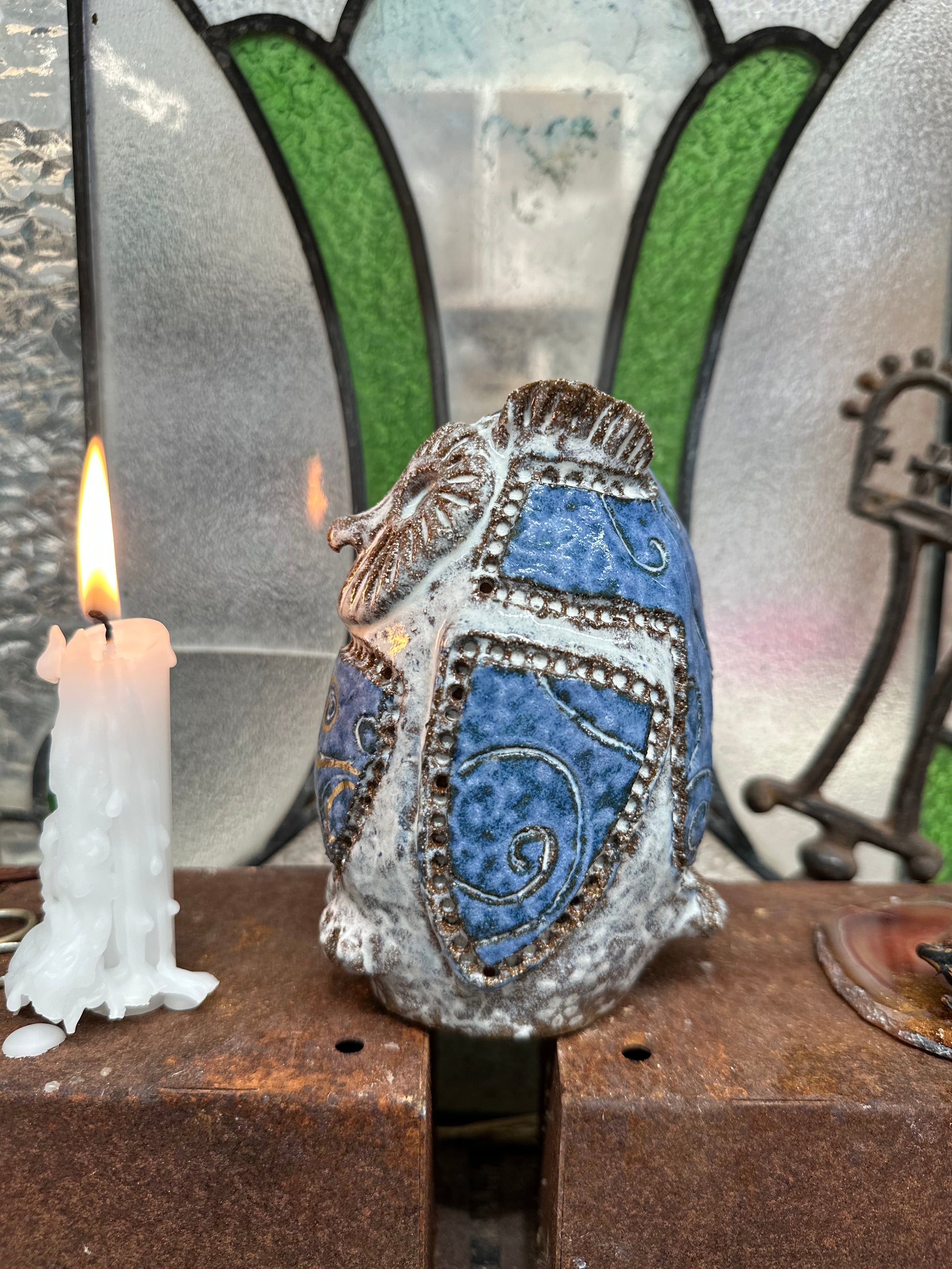 Wise watcher of the night, the Guardian Owl stands as a symbol of deep knowing and quiet protection. Cloaked in twilight blue and adorned with hand-painted golden spirals, this piece carries the essence of ancient wisdom and the mystery of the unseen.