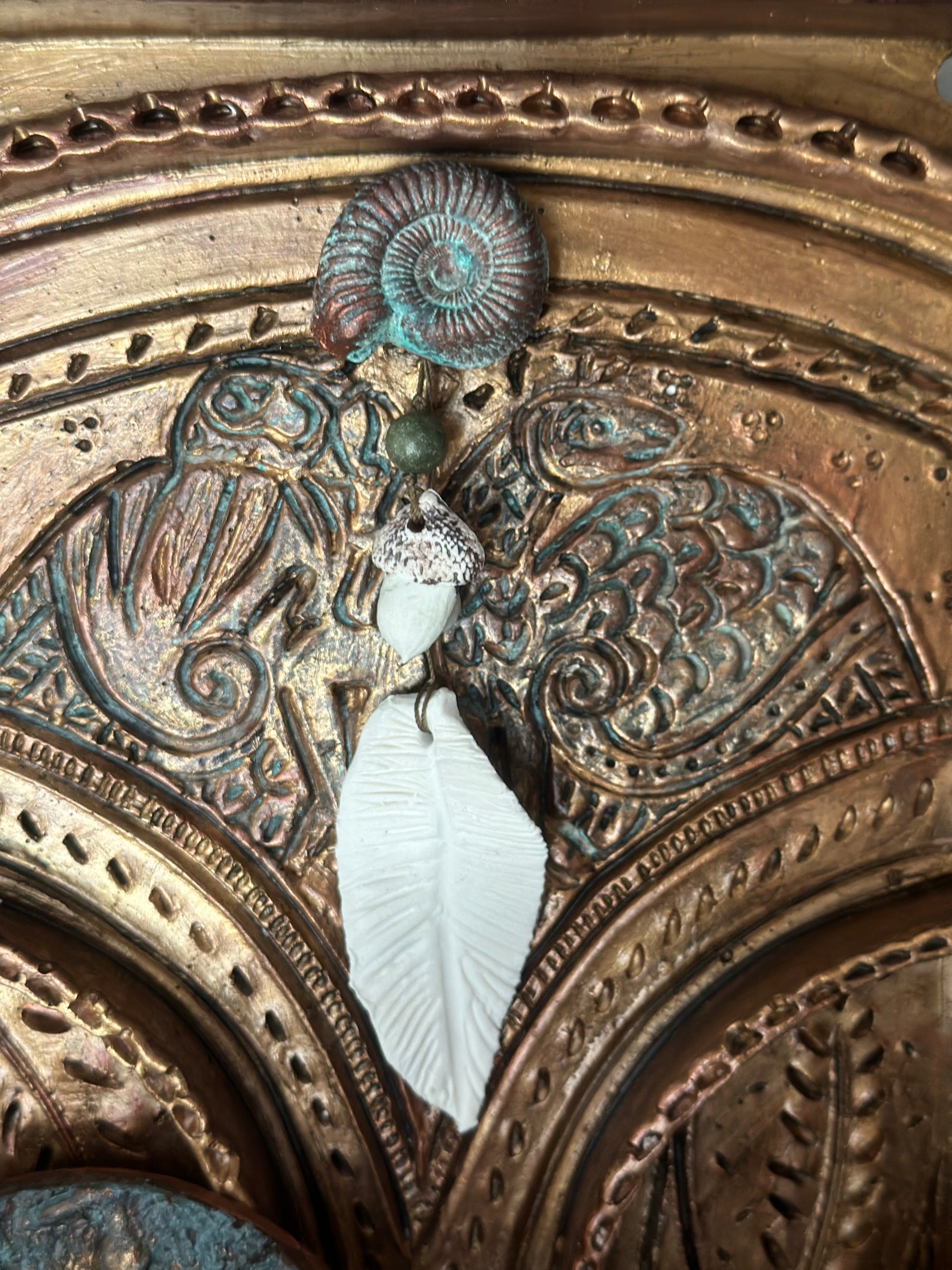 The ammonite spirals with the memory of time, grounding you in the eternal cycles of transformation. The feather speaks of spirit and breath, carrying prayers and intentions to unseen realms. The acorn, small yet potent, holds the promise of growth and strength - the seed from which great oaks arise. The aventurine bead brings balance and heart-led courage, encouraging prosperity and calm as you move through change.